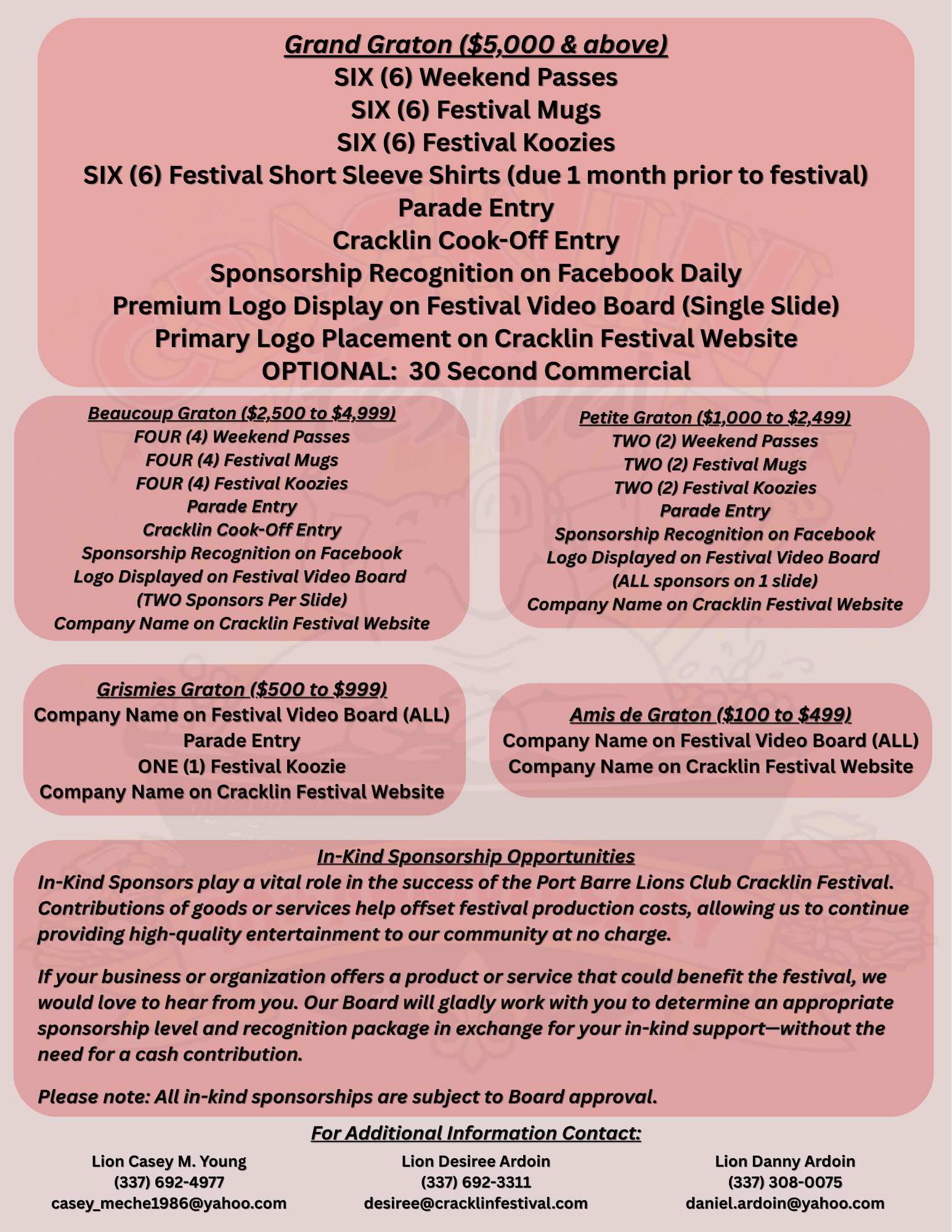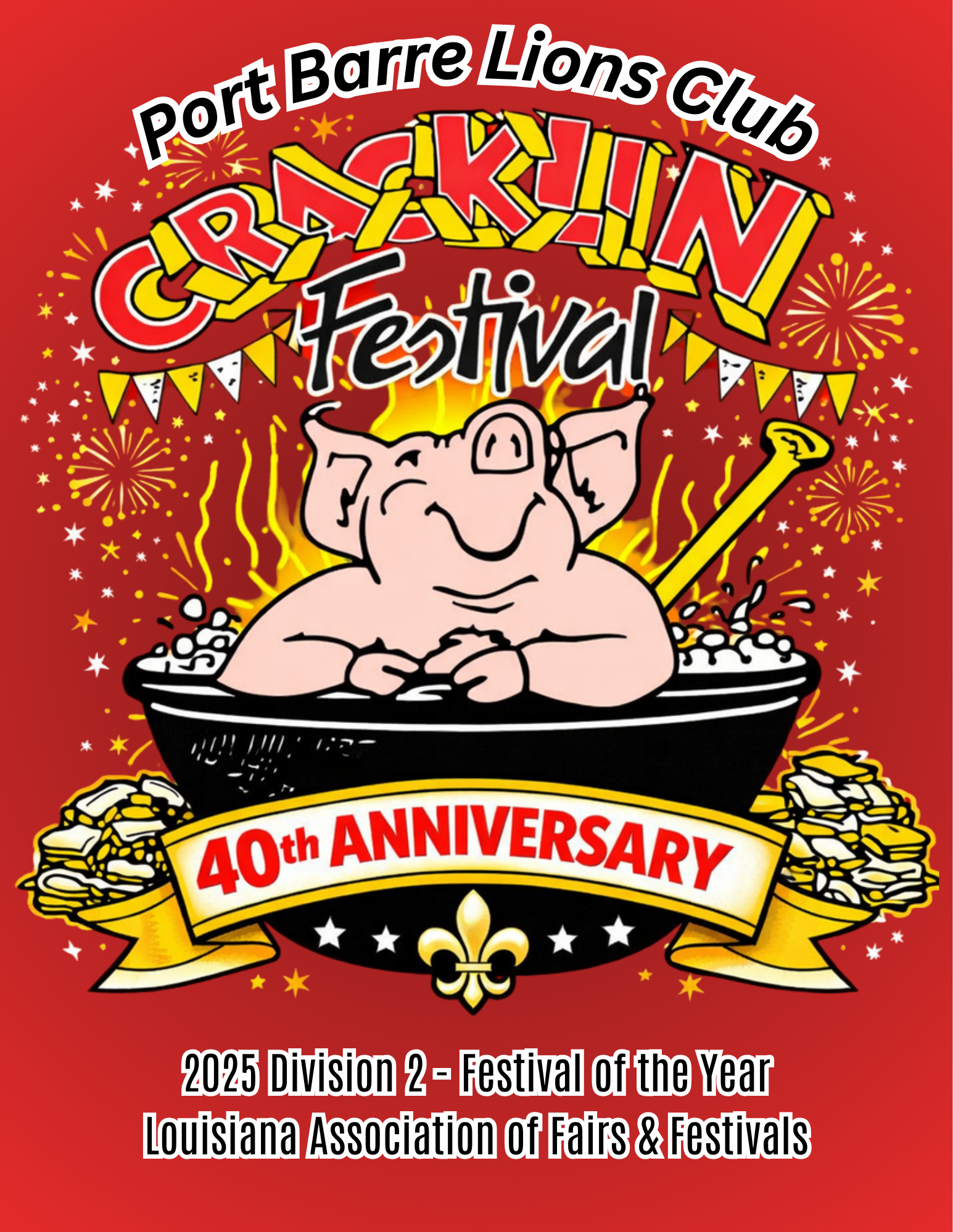 Organizing an event as large as the Cracklin Festival is no small task. It involves many moving parts, significant effort from numerous individuals, and considerable financial resources. As a charitable non-profit organization, the Port Barre Lions Club is deeply grateful to our sponsors who help offset many of the costs associated with hosting the Cracklin Festival. The businesses and organizations listed below have generously contributed their time, funds, and equipment to make this event possible. We encourage you to thank and support these valued partners whenever possible. To become a sponsor, click HERE!!!!!!